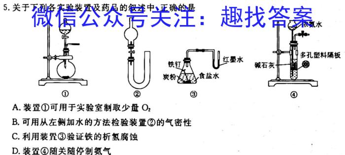 5.关于下列各实验装置及药品的叙述中,正确的是A.装置①可用于实验室制取少母O2B.可用从左侧加水的方法检验装置②的气密性C.利用装置③验证铁的析氢腐蚀D.装置④随关随停制氨气