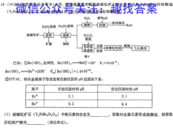 15.(14分)的常见化合价为+3价,我国蕴藏着丰富的硅铍矿,其主要成分为一种铍的硅酸盐(Y2FeBe2Si2O10),工业上通过如图8所示生产流程可获得氧化和氧化铍。已知:呈两性,Ksp[Be(OH)2]=1.610^-22。1Be(OH)2Be(OH)2BeO2^2-+2H^+K1=210^-31;Be(OH)2Be^2++2OH^-255^C时,相关金属离子形成氢氧化物沉淀的pH范围如下表:(1)硅铍钇矿石(Y2FeBe2Si2O10)中铁元素的价态为,浸取时金属元素形成硫酸盐,则浸取后钇的产物为(填化学式)。