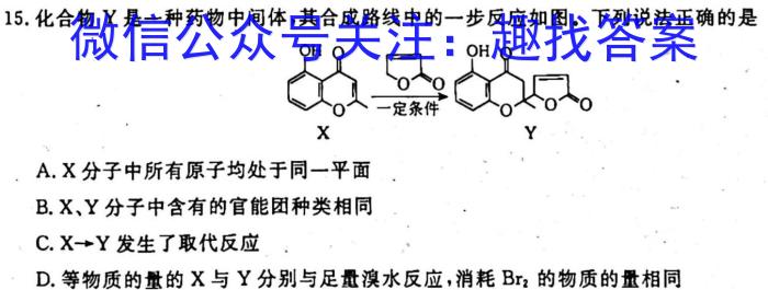 15.化合物Y是一种药物中间体,其合成路线中的一步反应如图。下列说法正确的是A.X分子中所有原子均处于同一平面B.X、Y分子中含有的官能团种类相同C.X→Y发生了取代反应D.等物质的量的X与Y分别与足量溴水反应,消耗Br2的物质的量相同