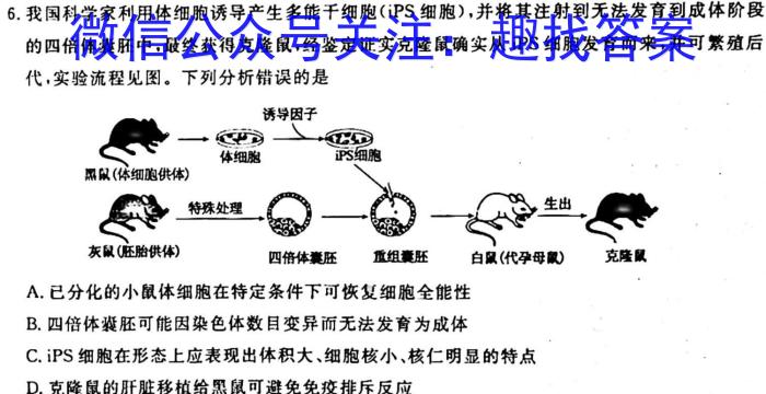 6.我国科学家利用体细胞诱导产生多能干细胞(iPS细胞),并将其注射到无法发育到成体阶段的四倍体囊胚中,最终获得克隆鼠,经鉴定证实克隆鼠确实从iPS细胞发育而来,并可繁殖后代,实验流程见图。下列分析错误的是A.已分化的小鼠体细胞在特定条件下可恢复细胞全能性B.四倍体囊胚可能因染色体数目变异而无法发育为成体C.iPS细胞在形态上应表现出体积大、细胞核小、核仁明显的特点D.克隆鼠的肝脏移植给黑鼠可避免免疫排斥反应