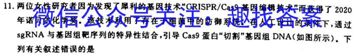 11.两位女性研究者因为发现了犀利的基因技术“CRISPR/Cas9基因编辑技术”而获得了2020年诺贝尔化学奖。该技术利用了存在于细菌中的防御系统。在人工设计的条件下,通过sgRNA与基因组靶序列的特异性结合,引导Cas9蛋白“切割”基因组DNA(如图所示)。下列有关叙述错误的是A.CRISPR/^’s9基因编辑和胰岛素基因转录过程中都会形成DNA、RNA、蛋白质的复合物B.CRISPR/Cas9基因编辑复合物中存在A-U和A-T的碱基配对方式C.sgRNA与基因组靶序列的特异性结合依赖碱基之间的配对现象D.Cas9蛋白通过断裂氢键“切割”基因组DNA