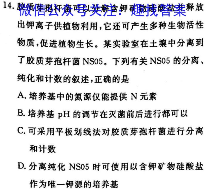 14.胶质芽孢杆菌可以分解含钾矿物硅酸盐并释放出钾离子供植物利用,它还可产生多种生物活性物质,促进植物生长。某实验室在土壤中分离到了胶质芽孢杆菌NS05。下列有关NS05的分离、纯化和计数的叙述,正确的是A.培养基中的氮源仅能提供N元素B.培养基pH的调节在灭菌前后进行都可以C.可采用平板划线法对胶质芽孢杆菌进行分离和计数D.分离纯化NS05时可使用以含钾矿物硅酸盐作为唯一钾源的培养基