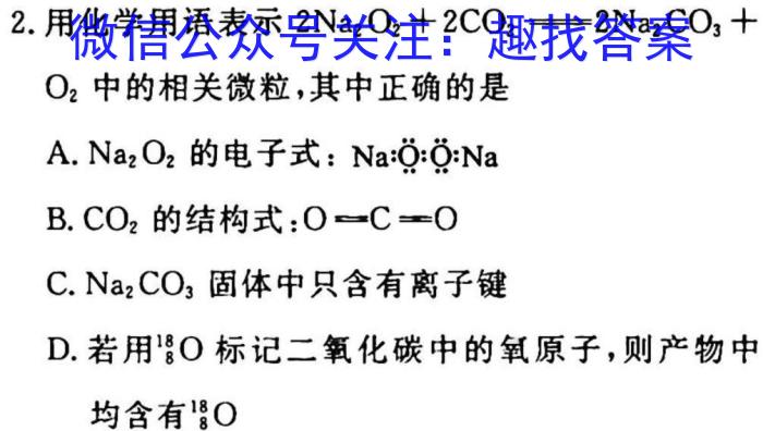 2.用化学用语表示2Na2O2+2CO22Na2CO3+O2中的相关微粒,其中正确的是A.Na2O2的电子式:B.CO2的结构式:O=C=0C.Na2CO3固体中只含有离子键D.若用’O标记二氧化碳中的氧原子,则产物中均含有O