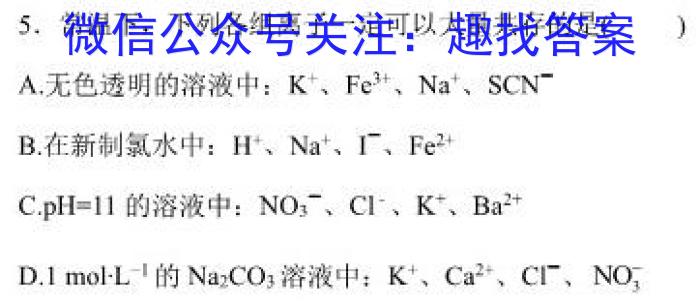 5.常温下,下列各组离子一定可以大量共存的是()A.无色透明的溶液中:K^+、Fe^3+、Na^+、SCN^-B.在新制氯水中:H^+、Na^+、I^-、Fe^2+C.pH=11的溶液中:NO3^-、Cl^-、K^+、Ba^2+D.1molL^-1的Na2CO3溶液中:K^+、Ca^2+、Cl^-、NO3^-