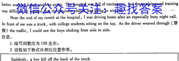 better working hours and less stress. The hospital was full of excitement, but the studying and trainingwas difficult. It seemed that the business choice was going to win out.Near the end of my month at the hospital, I was driving home after an especially busy night call.In front of me was a truck, with college students sitting on the top. As the driver weaved through (穿梭) the traffic, I could see the boys shaking from side to side.注意:1.续写词数应为150左右;2.请按如下格式在相应位置作答。Suddenly, a boy fell off the back of the truck.