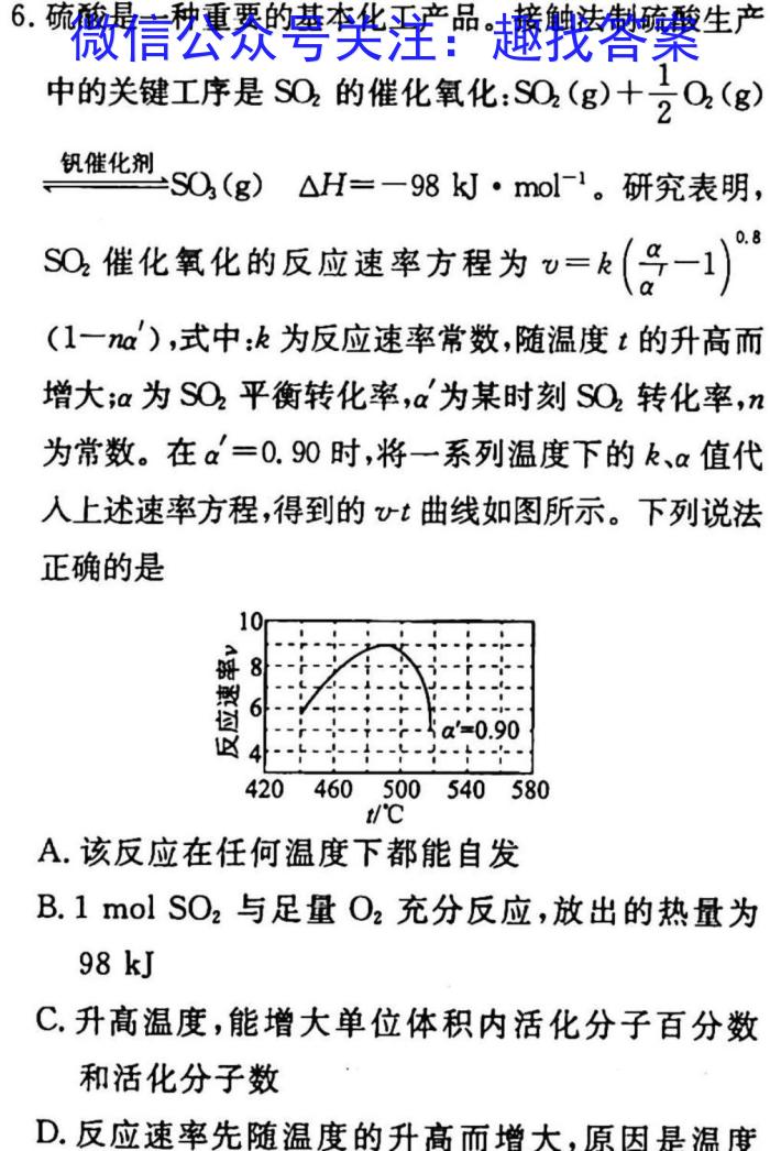 6.硫酸是一种重要的基本化工产品。接触法制硫酸生产中的关键工序是SO2的催化氧化:SO2(g)+12O2(g)钒催化剂SO3(g)H=-98kJmol^-1。研究表明,SO2催化氧化的反应速率方程为v=k(-1)(1-na’),,式中:k为反应速率常数,随温度t的升高而增大;α为SO2平衡转化率,为某时刻SO2转化率,n为常数。在α’=0.90时,将一系列温度下的k、a值代人上述速率方程,得到的vt曲线如图所示。下列说法正确的是A.该反应在任何温度下都能自发B.1molSO2与足量O2充分反应,放出的热量为98kJC.升高温度,能增大单位体积内活化分子百分数和活化分子数D.反应速率先随温度的升高而增大,原因是温度升高导致k、a均增大