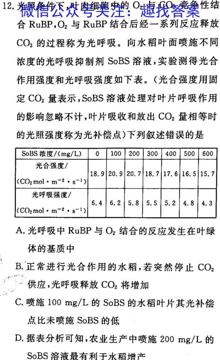 12.光照条件下,叶肉细胞中的O2与CO2竞争性结合RuBP,O2与RuBP结合后经一系列反应释放CO2的过程称为光呼吸。向水稻叶面喷施不同浓度的光呼吸抑制剂SoBS溶液,实验测得光合作用强度和光呼吸强度如下表。(光合强度用固定CO2量表示,SoBS溶液处理对叶片呼吸作用的影响忽略不计,叶片吸收和放出CO2量相等时的光照强度称为光补偿点)下列叙述错误的是A.光呼吸中RuBP与O2结合的反应发生在叶绿体的基质中B.正常进行光合作用的水稻,若突然停止CO2供应,光呼吸释放CO2将增加C.喷施100mg/L的SoBS的水稻叶片其光补偿点比未喷施SoBS的低D.据表分析可知,农业生产中喷施200mg/L的SoBS溶液最有利于水稻增产