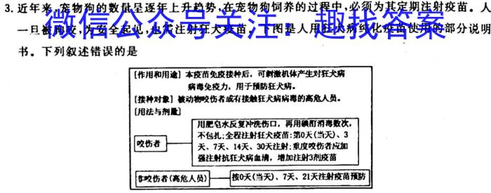 3.近年来,宠物狗的数量呈逐年上升趋势,在宠物狗饲养的过程中,必须为其定期注射疫苗。人一旦被狗咬,为安全起见,也需注射狂犬疫苗。下图是人用狂犬病纯化疫苗使用的部分说明书。下列叙述错误的是A.注射疫苗后,机体产生了抗体、效应T细胞和记忆细胞,从而产生了对狂犬病病毒的免疫力B.沿理伤口时,消毒数次,不包扎,能减少咬伤者被狂犬病病毒、厌氧菌等感染的机会C.全程多次注射狂犬疫苗,表明机体产生的抗体达到一定量后,才能有效抵御狂犬病病毒D.注射抗狂犬病血清相当于注射抗体,抗体能与侵入细胞内的狂犬病病毒发生特异性结合,直接消灭狂犬病毒