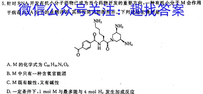 5.针对RNA开发有机小分子药物已成为当今药物开发的重要方向,一种有机小分子M会作用于病毒RNA分子的非翻译区,其结构简式如图所示。下列说法正确的是A.M的化学式为C20H30N5O3B.M中只有一种含氧官能团C.M既有酸性,又有碱性D.一定条件下,1molM与最多能与4molH2发生加成反应