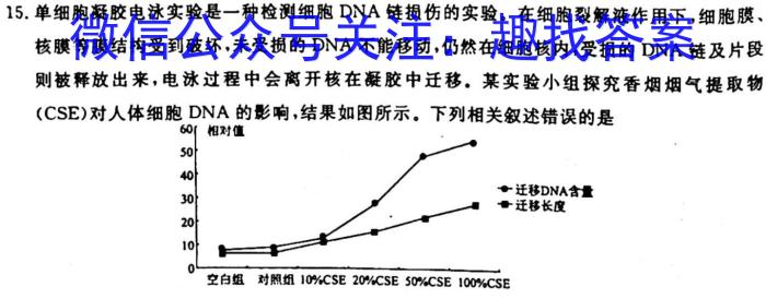 15.单细胞凝胶电泳实验是一种检测细胞DNA链损伤的实验。在细胞裂解液作用下,细胞膜、核膜等膜结构受到破坏,未受损的DNA不能移动,仍然在细胞核内,受损的DNA链及片段则被释放出来,电泳过程中会离开核在凝胶中迁移,某实验小组探究香烟气提取物(CSE)对人体细胞DNA的影响,结果如图所示。下列相关叙述错误的是60[相对值A.相同电泳条件下,DNA受损越严重,迁移DNA相对值越小B.DNA受损后,若其双链结构被解开,则DNA容易发生突变C.在进行电泳时,要预留一个加样孔,加人指示分子大小的标准参照物D.通过测母DNA迁移长度和检测迁移DNA的含量可推测细胞中DNA的损伤程度