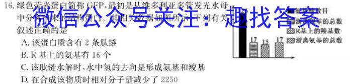 16.绿色荧光蛋白简称GFP,,最初是从维多利亚多管发光水母中分离出来的结构蛋白。其相关数据如图所示,下列有关叙述正确的是A.该蛋白质含有2条肽链B.R基上的氨基有16个C.该肽链水解时,水中氢的去向是形成氨基和羧基D.在合成该物质时相对分子量减少了2250