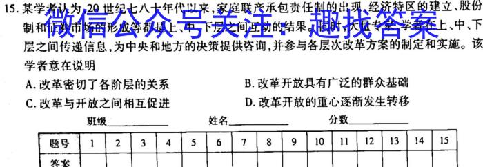 15.某学者认为,20世纪七八十年代以来,家庭联产承包责任制的出现、经济特区的建立、股份制和证券市场的形成等都是上、中、下层之间互动的结果。同时,大量专家、学者在上、中、下层之间传递信息,为中央和地方的决策提供咨询,并参与各层次改革方案的制定和实施。该学者意在说明A.改革密切了各阶层的关系B.改革开放具有广泛的群众基础C.改革与开放之间相互促进D.改革开放的重心逐渐发生转移班级姓名分数