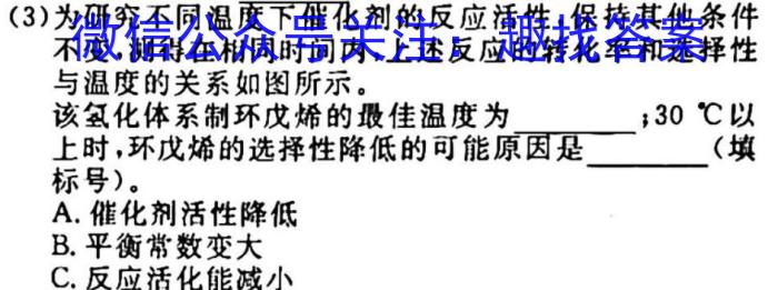 (3)为研究不同温度下催化剂的反应活性,保持其他条件不变,测得在相同时间内,上述反应的转化率和选择性与温度的关系如图所示。该氢化体系制环戊烯的最佳温度为;30^C以上时,环戊烯的选择性降低的可能原因是(填标号)。A.催化剂活性降低B.平衡常数变大C.反应活化能减小