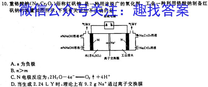 10.重铬酸钠(Na2Cr2O7)俗称红矾钠,是一种用途极广的氧化剂。工业一种利用铬酸钠制备红矾钠的装置如图所示,下列有关说法不正确的是连流电源A.a为负极B.n>mC.N电极反应为:2H2O-4e^-O2+4H^+D.当生成2.24LY时,理论上有9.2gNa^+通过离子交换膜