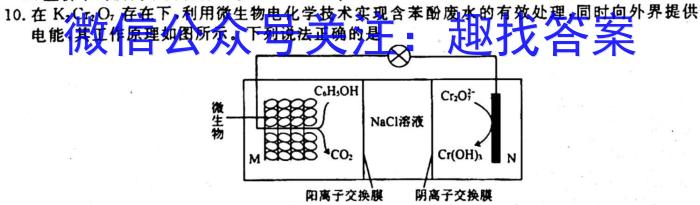 10.在K2Cr2O7存在下,利用微生物电化学技术实现含苯酚废水的有效处理,同时向外界提供电能,其工作原理如图所示。下列说法正确的是A.N极为电池的正极,产生OH^-B.工作一段时间后,NaCl溶液浓度增大C.M极的电极反应为OH+11H2O-23e^-6CO2+23H^+D.处理Cr2O7^2-时,OH^-从阴离子交换膜左侧向右侧移动