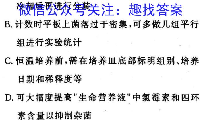 冷却后再进行分装B.计数时平板上菌落过于密集,可多做几组平行组进行实验统计C.恒温培养前,需在培养皿底部标明组别、培养日期和稀释度等D.可大幅度提高”生命营养液”中氯霉素和四环素含量以抑制杂菌