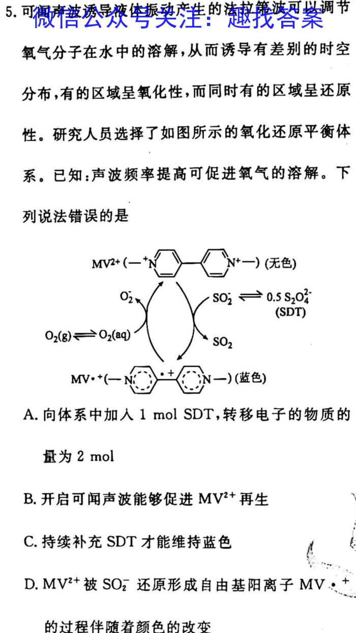 5.可闻声波诱导液体振动产生的法拉第波可以调节氧气分子在水中的溶解,从而诱导有差别的时空分布,有的区域呈氧化性,而同时有的区域呈还原性。研究人员选择了如图所示的氧化还原平衡体系。已知:声波频率提高可促进氧气的溶解。下列说法错误的是A.向体系中加入1molSDT,量为2molB.开启可闻声波能够促进MV^2+再生C.持续补充SDT才能维持蓝色D.MV^2-SO2^-还原形成自由基阳离子MV.的过程伴随着颜色的改变转移电子的物质的