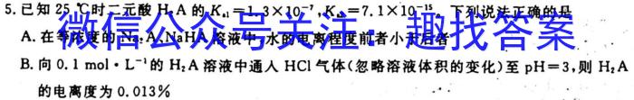 5.已知25^C时二元酸的。下列说法正确的是H2AKa1=1.310^-7,Ka2=7.110^-15A.在等浓度的Na2A、NaHA溶液中,水的电离程度前者小于后者B.向0.1molL^-的H2A溶液中通入HCl气体(忽略溶液体积的变化)至pF=3,则H2A的电离度为0.013%C.向H2A溶液中加入NaOH溶液至pH=11,则c(A^2-)>c(HA^-)D.取pH=a的H2A溶液10mL,加蒸馏水稀释至100mL,则该溶液pH=a+1