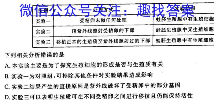 4.蛙受精卵下部含有一些特殊的蛋白质和mRN,,称为生殖质。用紫外线昭射受精卵下部能够破坏生殖质。某研究小组选择受精卵进行探究实验,处理方式和实验结果如下,下列相关分析错误的是A.本实验主要是为了探究生殖细胞的形成是否与生殖质有关B.实验一为对照组,可排除其他条件对实验结果造成影响C.实验二结果产生的直接原因是紫外线破坏了受精卵中的部分基因D.实验三可以表明生殖质可在不同受精卵之间进行移植且仍能保持活性