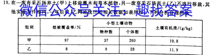 19.在一废弃采石场弃土(甲)上移栽灌木和草本植物,另一废弃采石场弃土(乙)不进行移栽,其他实验条件相同,一年后甲、乙两地统计的相关数据如表所示。下列分析合理的是A.甲地发生的演替属于次生演替,乙地发生的演替属于初生演替B.甲地小型土壤动物增多是移栽植物的结果C.人类的活动不会改变甲地演替的速度D.乙地因没有移栽乔木而不可能自然长出乔木