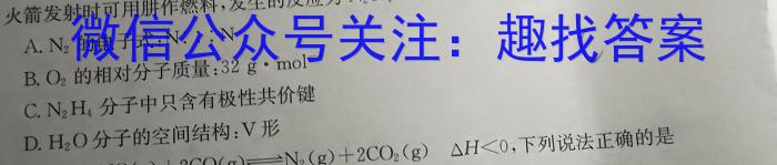 2.火箭发射时可用肼作燃料,发生的反应为NH+O——N+2HO,下列说法正确的是N2H4+O2N2+2H2O,A.N2的电子式:N:::NB.O2的相对分子质量:32gmol^-1C.N2H4分子中只含有极性共价键D.H2O分子的空间结构:V形C