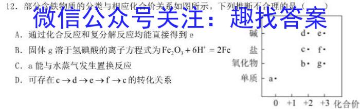 12.部分含铁物质的分类与相应化合价关系如图所示。下列推断不合理的是()A.通过化合反应和复分解反应均能直接得到eB.固体g溶于氢碘酸的离子方程式为Fe2O3+6H^+=2FeC.a能与水蒸气发生置换反应D.可存在c→d→c→f→c的转化关系