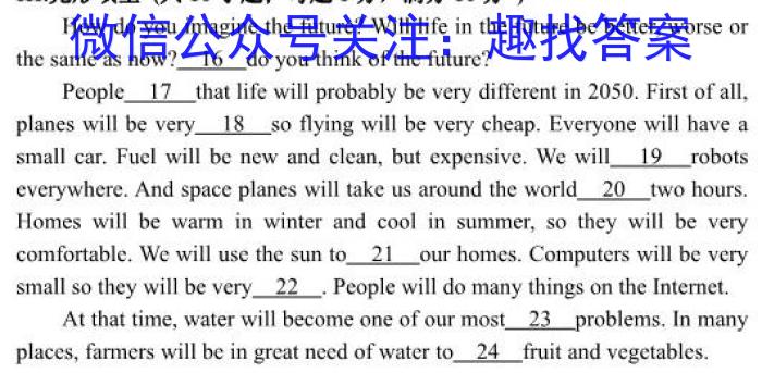 How do you imagine the future?Will life in the future be better, worse orthe same as now?16do you think of the future?People 17 that life will probably be very different in 2050. First of all,planes will be very 18 so flying will be very cheap. Everyone will have asmall car.Fuel will be new and clean, but expensive. We will 19 robotseverywhere.And space planes will take us around the world 20 two hours.Homes will be warm in winter and cool in summer, so they will be verycomfortable.We will use the sunto 21our homes. Computers will be verysmall so they will be very 22.People will do many things on the Internet.At that time, water will become one of our most 23 problems. In manyplaces, farmers will be in great need of water to 24 fruit and vegetables.