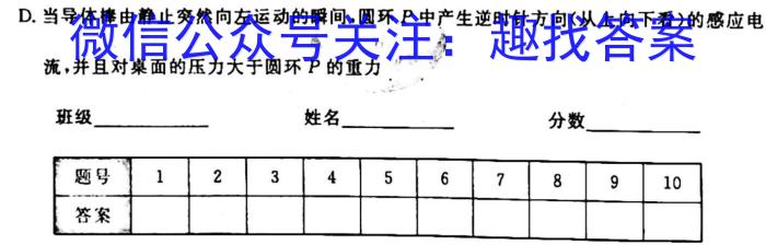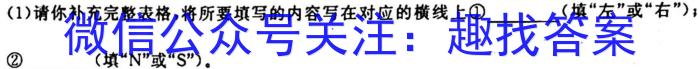 D.当导体棒由静止突然向左运动的瞬间,圆环P中产生逆时针方向(从上向下看)的感应电流,并且对桌面的压力大于圆环P的重力班级姓名分数(1)请你补充完整表格,将所要填写的内容写在对应的横线上①(填“左”或“右”);②(填^4N”或“S”)。