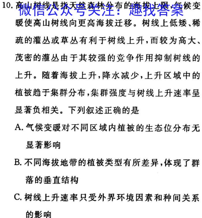 10.高山树线是指天然森林分布的海拔上限,气候变暖使高山树线向更高海拔迁移。树线上低矮、稀疏的灌丛或草丛有利于树线上升,而较为高大、茂密的灌丛由于其较强的竞争作用抑制树线的上升。随着海拔上升,降水减少,上升区域中的植被趋于集群分布,集群强度与树线上升速率呈显著负相关。下列叙述正确的是A.气候变暖对不同区域内植被的生态位分布无显著影响B.不同海拔地带的植被类型有所差异,体现了群落的垂直结构C.树线上升速率只受外界环境因素和种间关系的影响D.高山树线迁移的过程伴随着群落的演替
