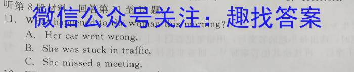 听第8段材料,回答第11至13题。11. What happened to the woman this morning?A. Her car went wrong.B.She was stuck in traffic.C. She missed a meeting.