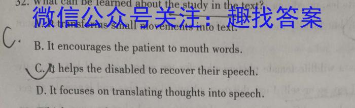 32. What can be learned about the study in the text?CA. It transforms small movements into text.B. It encourages the patient to mouth words.C.It helps the disabled to recover their speech.D. It focuses on translating thoughts into speech