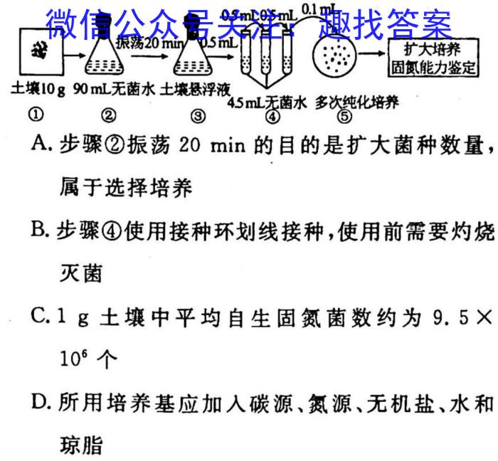 0.1mL0.5mL05mL^0.1mL振荡20扩大培养固氮能力鉴定土壤I0g90mL无菌水土壤悬浮液①45②mL无菌水多次纯化培养A.步骤②振荡20min的目的是扩大菌种数量,属于选择培养B.步骤④使用接种环划线接种,使用前需要灼烧灭菌土壤中平均自生固氮菌数约为9.5×10^6个D.所用培养基应加入碳源、氮源、无机盐、水和琼脂