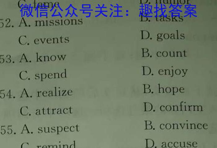 B.tasks52. A. missions sC.eventsD.goals53. A. knowC.spendD. enjoyB. countB.hope54. A. realizeC.attractD. confirmB. convince