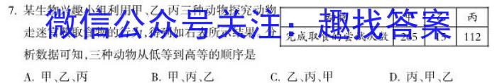 7.某生物兴趣小组利用甲、乙、丙三种动物探究动物走迷宫获取食物的行为,得到如右表所示结果。分析数据可知,三种动物从低等到高等的顺序是A.甲、乙、丙B.甲、丙、乙C.乙、丙、甲D.丙、甲、乙
