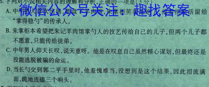 6.下列对小说相关内容的理解和分析,正确的一项是(3分)A.中年男人首次出场,要盘下羊肉馆,朱掌柜笑着拒绝了,他要把绝活留给“掌得稳勺”的传承人。B.朱掌柜本希望把朱记羊肉馆掌勺人的技艺传给自己的儿子,但两个儿子都不愿意,只能传给徒弟。C.中年男人仰天长叹,说天意呀。他是在叹息自己虽然精心谋划,但最终还是没能逃脱被骗的命运。D.当长勺交到郭二平手里时,他羞愧难当,没想到是这个结果,因此泪流满面,跪地连磕三个响头。