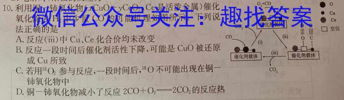 10.利用铜一铈氧化物(xCuO-yCeO2,Ce是活泼金属)催化氧化除去H2中少量C的可能机理如图所示。下列说法正确的是A.反应(中Cu、Ce化合价均未改变B.反应一段时间后催化剂活性下降,可能是Cu被还原成Cu所致C.若用^BO2参与反应,一段时间后,18不可能出现在铜铈氧化物中D.铜一氧化物减小了反应2CO+O22CO2的反应热