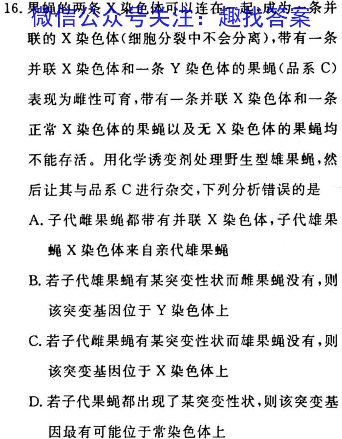 16.果蝇的两条X染色体可以连在一起,成为一条并联的X染色体(细胞分裂中不会分离),带有一条并联X染色体和一条Y染色体的果蝇(品系C)表现为雌性可育,带有一条并联X染色体和一条正常X染色体的果蝇以及无X染色体的果蝇均不能存活。用化学诱变剂处理野生型雄果蝇,然后让其与品系C进行杂交,下列分析错误的是A.子代雌果蝇都带有并联X染色体,子代雄果蝇X染色体来自亲代雄果蝇B.若子代雄果蝇有某突变性状而雌果蝇没有,则该突变基因位于Y染色体上C.若子代雌果蝇有某突变性状而雄果蝇没有,则该突变基因位于X染色体上D.若子代果蝇都出现了某突变性状,则该突变基因最有可能位于常染色体上