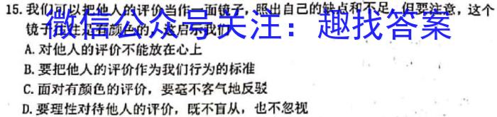 15.我们可以把他人的评价当作一面镜子,照出自己的缺点和不足,但要注意,这个镜子往往是有颜色的,这启示我们A.对他人的评价不能放在心上B.要把他人的评价作为我们行为的标准C.面对有颜色的评价,要毫不客气地反驳D.要理性对待他人的评价,既不盲从,也不忽视