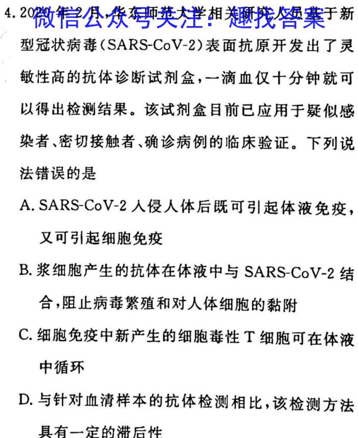 4.2020年2月,华东师范大学相关研究人员基于新型冠状病毒(SARS-CoV-2)表面抗原开发出了灵敏性高的抗体诊断试剂盒,一滴血仅十分钟就可以得出检测结果。该试剂盒目前已应用于疑似感染者、密切接触者、确诊病例的临床验证。下列说法错误的是人侵人体后既可引起体液免疫,又可引起细胞免疫A.SARS-CoV-2B.浆细胞产生的抗体在体液中与SARS-CoV-2结合,阻止病毒繁殖和对人体细胞的黏附C.细胞免疫中新产生的细胞毒性T细胞可在体液中循环D.与针对血清样本的抗体检测相比,该检测方法具有一定的滞后性