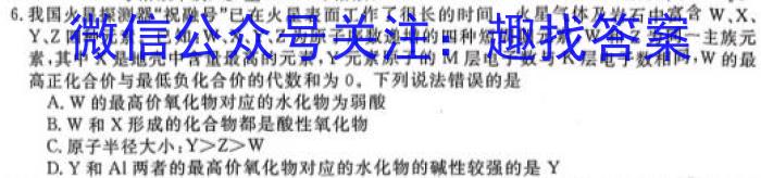 6.我国火星探测器“祝融号”已在火星表而工作了很长的时间。火星气体及岩石中富含W、X、Y、Z四种元素,已知:W、X、Y、Z为原子序数递增的四种短周期元素,W和Z为同一主族元素,其中X是地壳中含量最高的元素,Y元素原子的M层电子数与K层电子数相同,W的最高正化合价与最低负化合价的代数和为0下列说法错误的是A.W的最高价氧化物对应的水化物为弱酸B.W和X形成的化合物都是酸性氧化物C.原子半径大小:YYZZ>WD.Y和Al两者的最高价氧化物对应的水化物的碱性较强的是Y