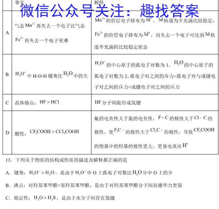 13.下列关于物质的结构或性质的描述及解释都正确的是A.键角:H3O^+>H2O,,是由于H3O^+中O上孤电子对数比H2O分中0上的少B.沸点:对羟基苯甲醛>邻羟基苯甲醛,是由于对羟基苯甲醛分子间范德华力更强C.稳定性:H2O>H2S,,是由于水分子间存在氢键D.酸性:CH2ClCOOH>CH3COOH,,是由于CH2ClCOOH的羧基中羟基极性更小
