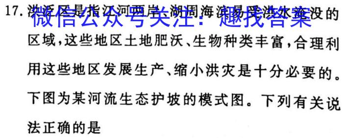 17.洪泛区是指江河两岸、湖周海滨易受洪水淹没的区域,这些地区土地肥沃、生物种类丰富,合理利用这些地区发展生产、缩小洪灾是十分必要的。下图为某河流生态护坡的模式图。下列有关说法正确的是