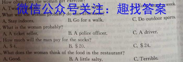 1.. How often does the woman get exerciseA. Twice a month. B. Twice a week. C.Four times a week.2.What will the woman probably do this afternoon?A. Stay indoors. B. Go for a walk. C.Do outdoor sports.3.What is the woman probably?A. A ticket seller. B. A police officer. C.A driver.How much will the man pay for the socks?A.$4.B.$20. C.$24.5.What does the woman think ofA. Good.vom an think of the food in the restaurant?