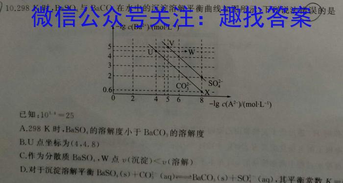 10.298K时,BaSO4与BaCO3在水中的沉淀溶解平衡曲线如图所示,下列说法错误的是已知:10^1.4=25A.2981K时,BaSO4的溶解度小于BaCO3的溶解度B.U点坐标为(4,4.8)C.作为分散质BaSO4,W点(沉淀)<v((溶解)D.对于沉淀溶解平衡BaSO4(s)+CO3^2-(aq)BaCO3(s)+SO4^2-(aq)其平衡常数
