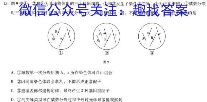 15.图9中①D、②和③为某动物体内的三个精原细胞,①和②发生了染色体变异,③为正常细胞。②减数分裂时三条同源染色体中任意两条正常分离,另一条随机移向一极。不考虑其他变异,下列叙述错误的是图9A.①减数第一次分裂后期A、a所在染色体可自由组合B.②因同源染色体联会素乱,不能形成正常配子C.③遵循孟德尔遗传定律,最终产生2种基因型配子D.①的变异类型可在减数分裂过程中通过光学显微镜观察到(1)在光合作用过程中,直接为C3还原成糖提供能量的物质有。植物的光合产物主要以形式运输提供给各器官。若突然停止光照,短时间内黄精叶肉细胞中RuBP(C5)的含量会(填“减少”“不变”或“增多”)。