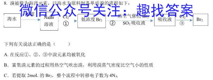 8.溴被称为海洋元素,以海水为原料制备单质溴的流程如下:浓缩NaBrCl2热空气催出海水Br2Cl2Br2吸收液Br2溶液①②SO2③低浓度吸收液下列有关说法正确的是()A.在反应①、②、③中溴元素均被氧化B.富集溴元素的过程用热空气吹出溴,利用溴蒸气密度比空气小的性质C.若提取2moL的Br2,,整个流程中转移电子数为4NA