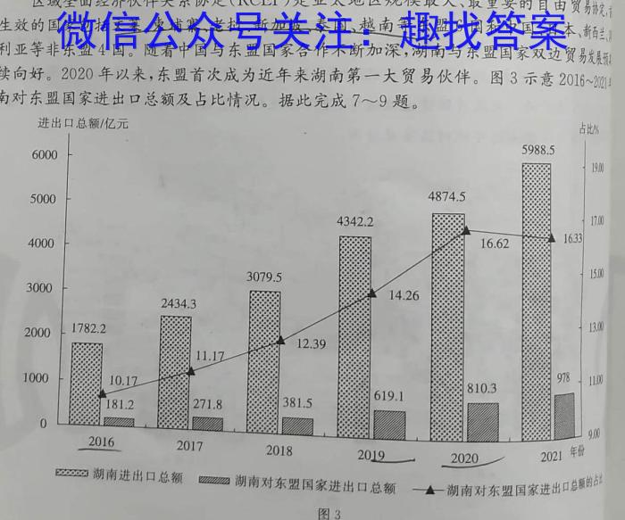 区城面经济伙伴关系协定(RCEP)是亚太地区规模最大、最重要的自由贸易生效的国家包括文莱、柬埔赛、老挝新加坡泰国、越南等东盟6国和中国、日本、新利亚等非东盟4国。随着中国与东盟国家合作不断加深,湖南与东盟国家双边贸易发续向好。2020年以来,东盟首次成为近年来湖南第一大贸易伙伴。图3示意016~南对东盟国家进出口总额及占比情况。据此完成7∼9题。B300