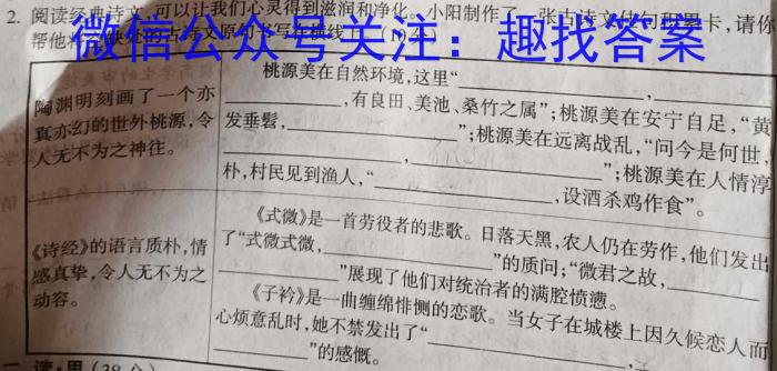 2.阅读经典诗文,可以让我们心灵得到滋润和净化。小阳制作了一张古诗文佳句积累卡,帮他将空缺处的古诗文原句书写在横线上。(10分),青你桃源美在自然环境,这里“渊明刻画了一个亦,真亦幻的世外桃源,令发垂髫,,有良田、美池、桑竹之属”;桃源美在安宁自足“黄人无不为之神往。,”;桃源美在远离战乱,“问今是何世朴,村民见到渔人,“”;桃源美在人情淳,设酒杀鸡作食”。《诗经》的语言质朴,情了“式微式微,《式微》是一首劳役者的悲歌。日落天黑,农人仍在劳作,他们发出感真挚,令人无不为之”展现了他们对统治者的满腔愤懑。,”的质问;“微君之故,动容。心烦意乱时,她不禁发出了“《子衿》是一曲缠绵悱恻的恋歌。当女子在城楼上因久候恋人而”的感慨。二、读思(38分),,