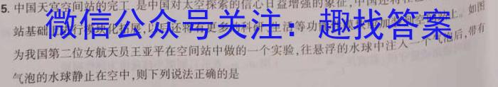 5.中国天宫空间站的完工,是中国对太空探索的信心日益增强的象征,中国还将在已经完工的空间站基础上进行模块化拓展,以后还将有更多的科研、生活等功能性模块舱加装到空间站上。如图为我国第二位女航天员王亚平在空间站中做的一个实验,往悬浮的水球中注人一个气泡后,带有气泡的水球静止在空中,则下列说法正确的是A.水球表面张力表明,表面层水分子间的平均距离比内部分子间平均距离小B.由于处于完全失重状态,气泡内气体的压强与舱内气体压强相等C.气泡内气体分子速率呈现“中间多、两头少”的分布规律D.温度升高时,气泡内所有气体分子运动的速率都增大