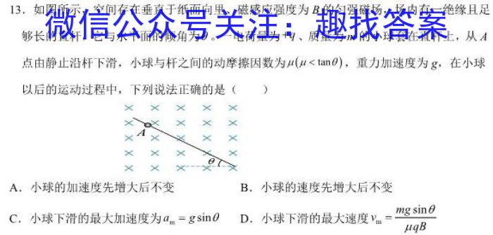 13.如图所示,空间存在垂直于纸面向里、磁感应强度为B的匀强磁场,场内有一绝缘且足够长的直杆,它与水平面的倾角为θ。。一电荷量为+q、质量为m的小球套在直杆上,从A点由静止沿杆下滑,小球与杆之间的动摩擦因数为(<tanθ),,重力加速度为g,,在小球以后的运动过程中,下列说法正确的是()A.小球的加速度先增大后不变B.小球的速度先增大后不变C.小球下滑的最大加速度为am=gD.小球下滑的最大速度vm=mgqB(1)若想减少从目镜中观察到的条纹数,该同学可A.将单缝向双缝靠近B.将屏向靠近双缝方向移动C.将屏向远离双缝的方向移动D.使用间距更小的双缝